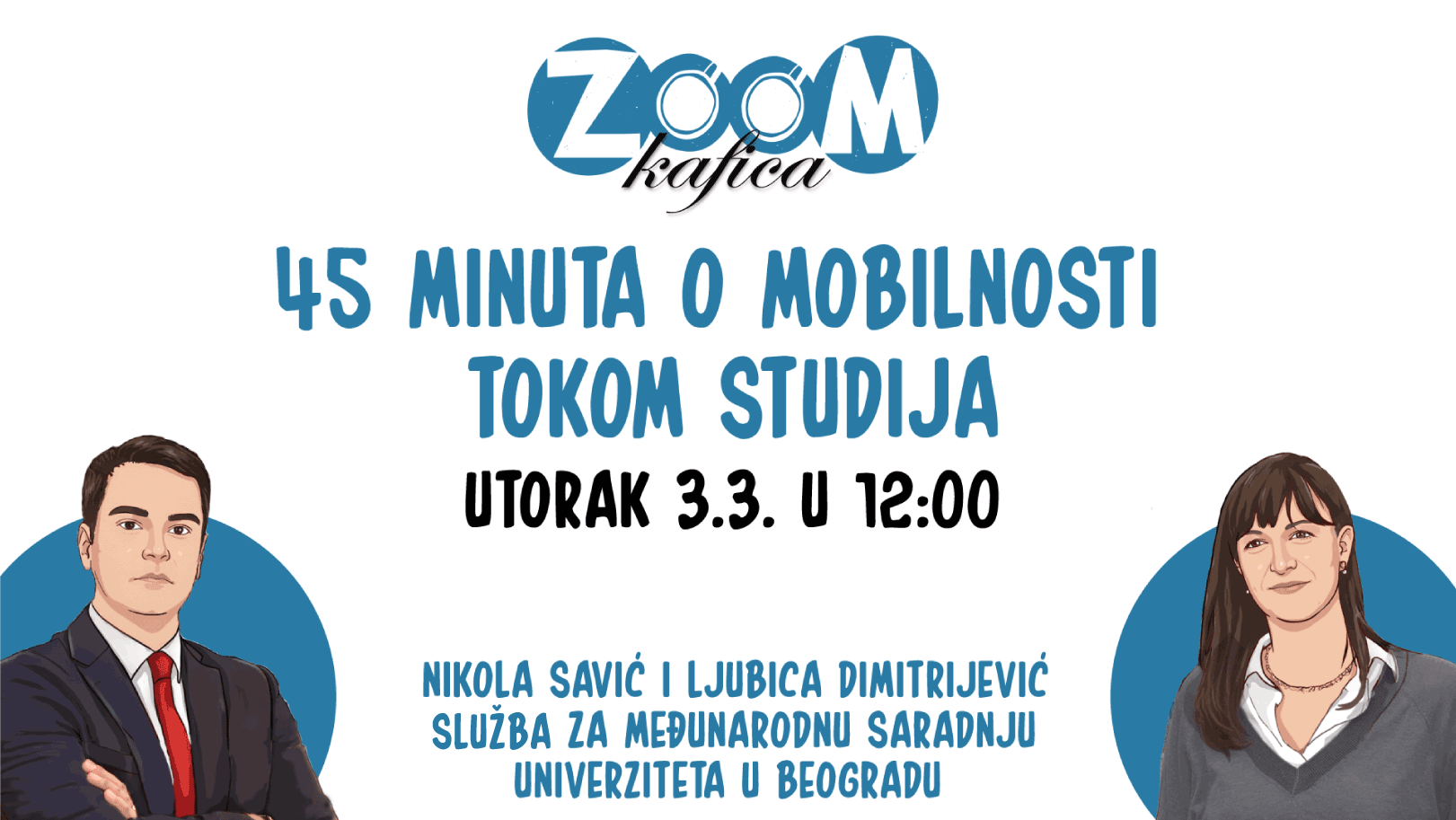 Odgovore na ova i druga pitanja daće ti naše kolege Ljubica Dimitrijević i Nikola Savić iz Službe za međunarodnu saradnju Univerziteta u Beogradu. Tokom razgovora biće predstavljeni i aktuelni konkursi za mobilnost studenata Univerziteta u Beogradu.